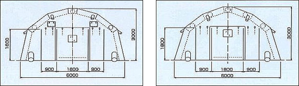 Moreover, expansion can be performed within a short time period when necessary, approx. 3 min with the Jet Blow system (air blower), approx. 1 min with an air cylinder, so that it is a suitable tent for emergencies or migration.