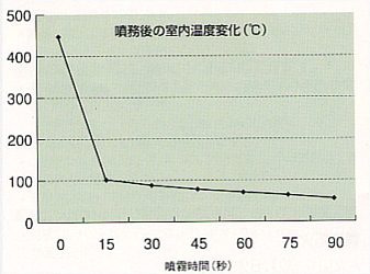 With the optimized mist (droplet size of the mist and the water content) produced by the Jet Firefogging System, fire fighting is carried out effectively due to 1) cooling effects, 2) suffocating effects, and 3) dilution effects. With the optimization of the mist, the water-based fire fighting capacity is drawn out to the upper limit; the amount of water used to fight the fire is extremely small compared to conventional large-scale water discharge fire fighting, and it is also possible to fight class B fires.