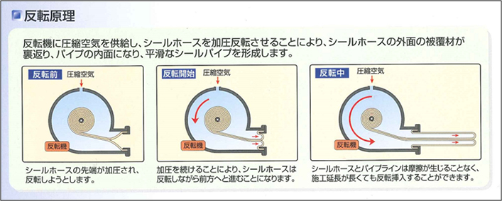 PALTEM HL (Hose Lining) is a method of rehabilitating pipes by inserting a liner inside out into the pipe using air pressure. What characterizes PALTEM HL is a structure composed of a base hose (a seamless woven jacket with an extruded cover) treated with various reinforcement layers, making it adaptable to a wide range of construction and engineering conditions.